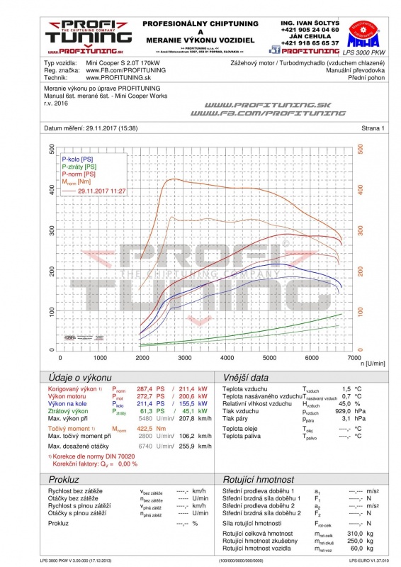 Ešte koncom minulého roka sme upravili jedno veľmi pekné a zaujímavé autíčko. Jedná sa poslednú generáciu Mini Cooper v réžii MINI JOHN COOPER WORKS, ktorý pod kapotou ukrýva motor 2.0T a jeho technický sériový výkon je 231k (170kW) a 320Nm. Vozidlo malo upravený výfuk od Mini Works a jeho reálne odmeraný sériový výkon bol vyšší - 239k a 329Nm. Po našej dôkladnej softvérovej úprave sme výkon navýšili na stabilných 287k (211kW) a 422Nm. Veľmi rýchle a zábavne autíčko.