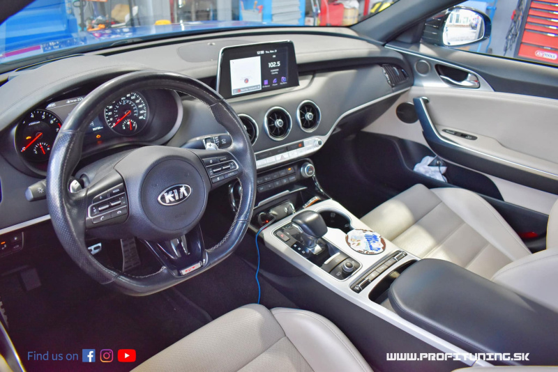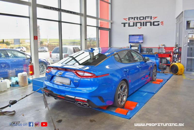 Trvalo mnoho rokov, pokiaľ automobilka Kia urobila svoje prvé poctivé GT-čko. Kia to s útokom na prémiovú triedu športových vozidiel zobrala absolútne vážne a aj proporcie karosérie vizuálne pripomínajú Maserati. Nezabudlo sa pritom ani na poriadny motor. Pod kapotou sa ukrýva objemná 3.3-litrov benzínová V6 s 2 turbami a technickým sériovým výkonom 370k a 510Nm. O jazdu sa stará 8° automatická prevodovka a pohon 4x4. Reálne odmeraný výkon bol presne 402k a 598Nm, čo je viac, ako udáva výrobca. Po našej softvérovej úprave sme výkon navýšili na uctihodných 493k (362kW) a 655Nm.