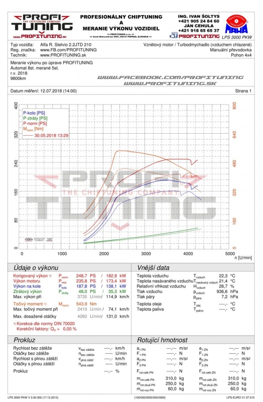 Aj keď je leto v plnom prúde, každý sa poteší novému SUV od Alfy s pohonom 4x4 - Alfa Romeo Stelvio. Pod kapotou sa ukrýva dieselový motor 2.2 MJTD a svojím sériovým výkonom 210k (154kW) a 480Nm určite zaujme. Po vstupnom meraní sme odmerali sériový výkon 210k a 445Nm. Po dôkladnej úprave sme výkon navýšili na stabilných 249k (183kW) 544Nm.