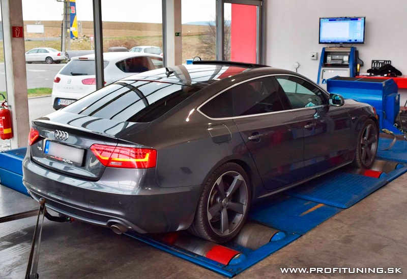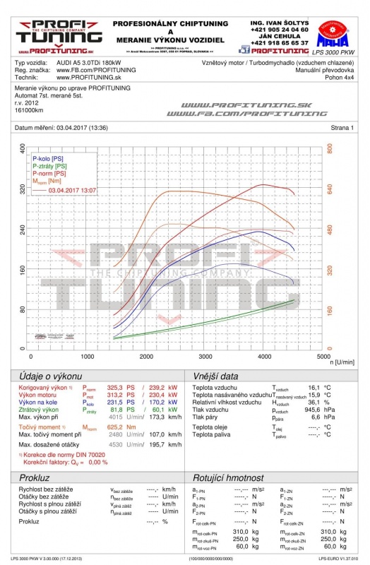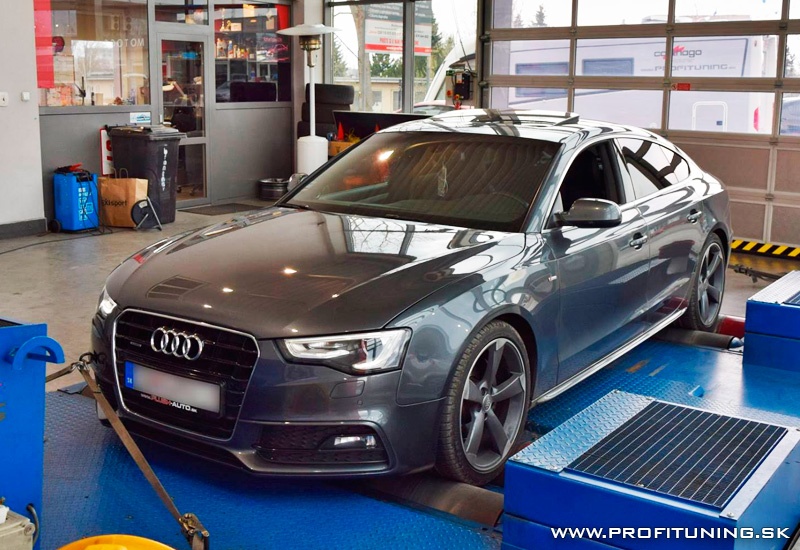 Vieme, že audinky sa Vám veľmi páčia, preto Vám predstavíme ďalšiu z našich úprav. Tentokrát A5 už s tradičným motorom 3.0 TDi (ktorý má veľkú výkonovú rezervu) a technickým sériovým výkonom 245k (180kW) a 550Nm S-Tronic. Odmeraný presný sériový výkon bol 237k a 495Nm. Po štandardnej úprave Profituning sme tento výkon navýšili na 325k (239kW) a 625Nm s veľmi pekným priebehom.