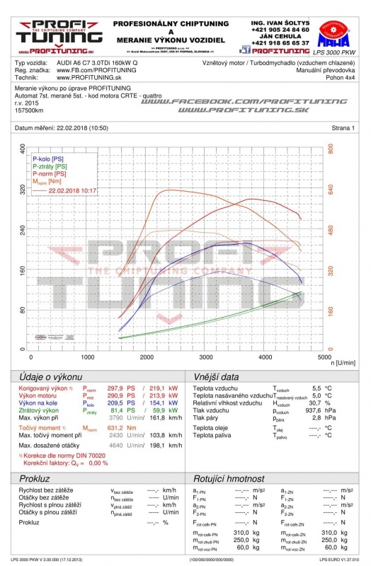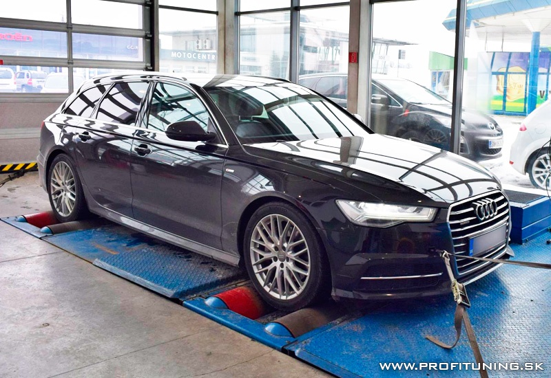 Práve prebieha v Ženeve autosalón, kde sa predstavila najnovšia A6. No ani zatiaľ aktuálna A6 nie je na zahodenie. Práve opak je pravdou. Je to veľmi pekné a vydarené autíčko s poctivým motorom 3.0 TDI. Jeho technický sériový výkon je 218k (160kW) a 500Nm (kód motora CRTE). Odmeraný sériový výkon bol 217k a 475Nm. Po dôkladnej softvérovej úprave sme výkon navýšili na bezpečných a veľmi dobre citeľných 298k (219kW) a 631Nm s naozaj krásnym priebehom. Na takúto A6 výkon práve akurát.
