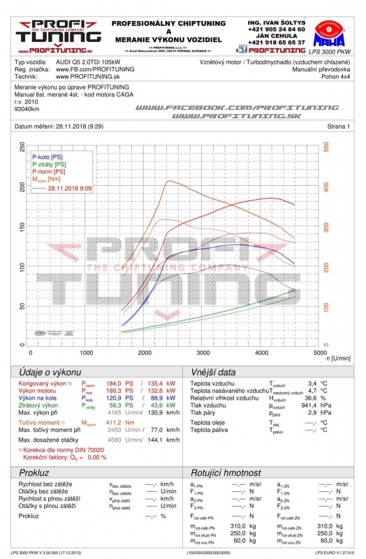 Audi Q5 je super auto, no ťažké a povedzme si úprimne s motorom 2.0 TDI v kombinácií s pohonom Quattro to nie je žiadna sláva. Takýto chiptuning mu naozaj pomôže nielen v zrýchlení, ale najmä pri pružnom predbiehaní, kde sa zníži doba predbiehania a tým pádom je to bezpečnejšie. Audi Q5 s motorom 2.0 TDI disponuje sériovým výkonom 143k (105kW) a 320Nm (kód motora CAGA). Odmeraný sériový výkon bol celkom presný a to 141k a 318Nm. Odmeraný výkon po našej úprave bol 184k (135kW) a 411Nm. Ak máte aj Vy záujem o úpravu, príďte si k nám po ďalšie kone alebo si len príďte dať odmerať a skontrolovať výkon Vášho vozidla.