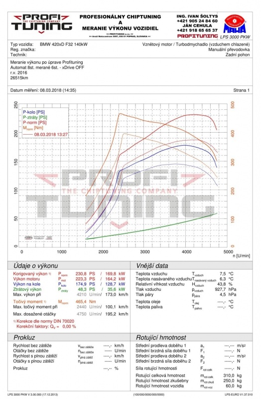 Nová generácia a jej facelift si dlho sériový výkon neužil. Pod svojou kapotou môže ukrývať mnoho motorov. Táto konkrétna mala pod kapotou už tradičný motor s označením 20d s technickým sériovým výkonom 190k (140kW) a 400Nm. Vstupné meranie odmeralo hodnoty 185k a 395Nm. Po štandardnej softvérovej úprave PROFITUNING sme výkon zdvihli na slušných 230k (170kW) a 465Nm.