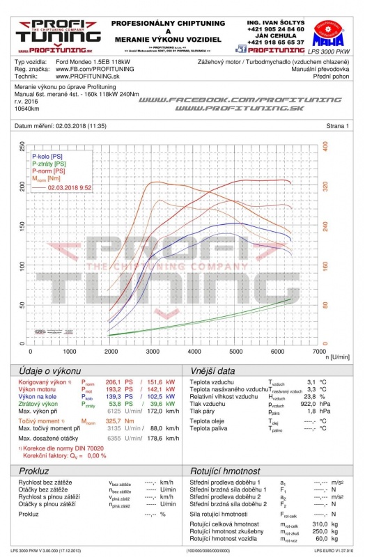 Už je to asi taká tradícia, že pondelky Vám prinášame novinky. Tentokrát je to nový Ford Mondeo s motorom 1.5 EcoBoost. Jeho technický sériový výkon je 160k (118kW) a 240Nm. Reálne odmeraný sériový výkon bol 180k a 280Nm. Tento motor 1.5EB sa výraba aj vo výkonovej verzí 181k (133kW) a 295Nm. Po našej softvérovej úprave sme výkon navýšili na citeľných 206k (152kW) a 325Nm.
