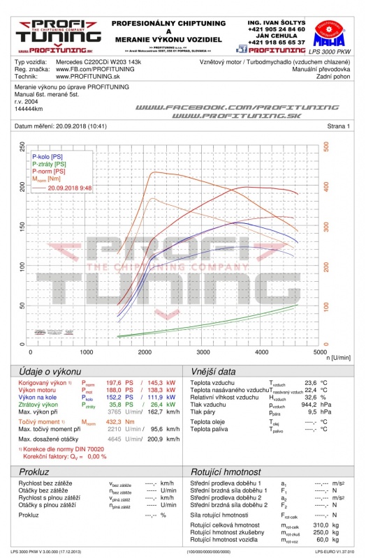 Nedávno nám prešlo rukami jedno staršie no zaujímavé auto. Mercedes W203 s označením C220 CDI sa vyrábalo v rôznych výkonových verziách pre rôzne európske trhy. Väčšina z nich má však identický motor pod kapotou a dá sa skvelo upraviť. Samozrejme ak je motor zdravý a majiteľ sa o neho poctivo stará. Technický sériový výkon je 143k (105kW) a 315Nm, no reálne odmeraný sériový výkon bol 161k a 365Nm. Po naše štandardnej softvérovej úprave sme výkon navýšili na 198k (148kW) a 432Nm.
