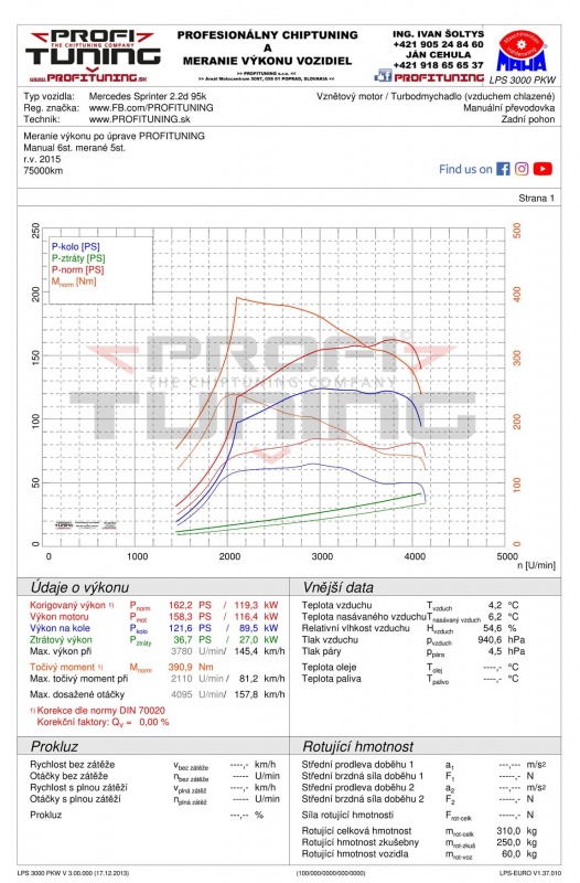 Dôležitým faktom je, že každý výkonový variant má úplne identický motor, preto sa dá aj z tej najslabšej výkonovej verzie 70kW dosiahnuť výkon až približne 120kW. Tento konkrétny Sprinter disponuje sériovým technickým výkonom 95k (70kW) a 250Nm. Odmeraný sériový výkon bol 89k a 250Nm. Po dôkladnej softvérovej úprave sme výkon navýšili na 162k (119kW) a 391Nm.