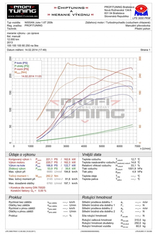 Nissan JUKE 1.6 DiG-T so sériovým výkonom 190k a 240Nm dosiahol po úprava Profituning 221k a 282Nm.