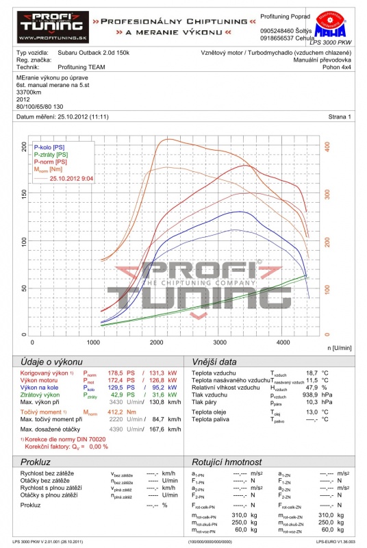 Výkonu nikdy nie je dosť. Aj tomuto Subaru Outback s motorom 2.0d a technickým sériovým výkonom 147k (108kW) a 350Nm sme výkon navýšili. Odmeraný sériový výkon bol 140k a 350Nm