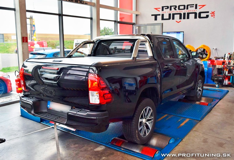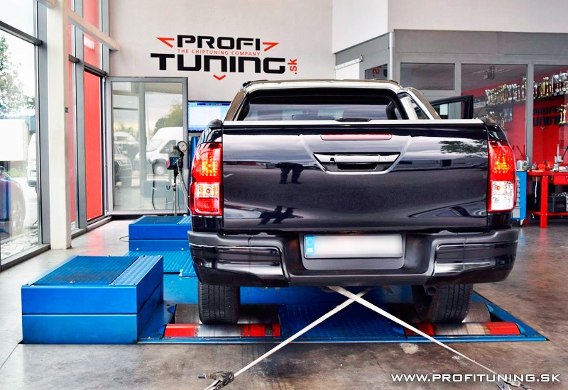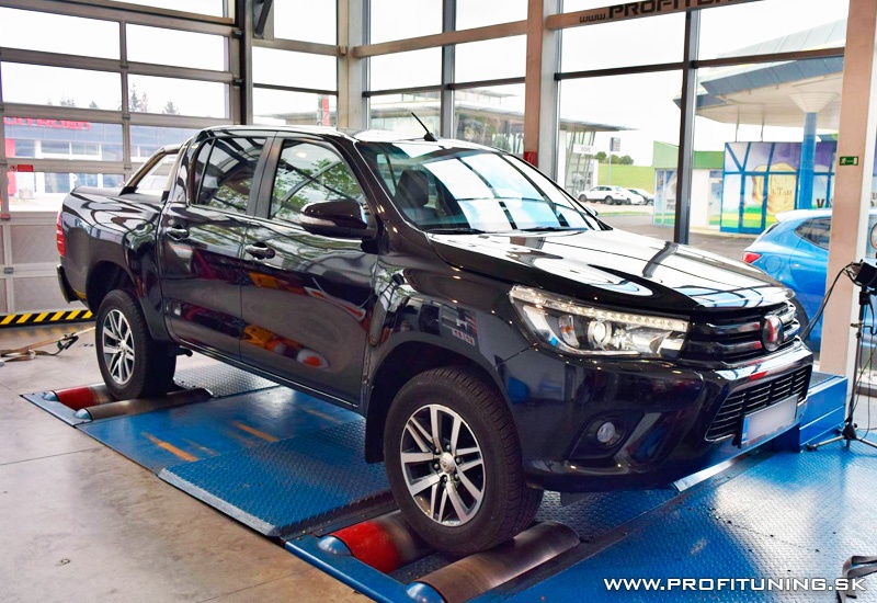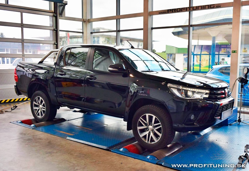 Posledná generácia Toyoty Hilux je naozaj skvelý pracant, no čo mu najmä chýba je výkon. Motor 2.4 D-CAT disponuje technickým sériovým výkonom 150k (110kW) a 400Nm, no len technickým. Reálne odmeraný výkon je nižší a to 143k a najmä krútiaci moment 342Nm. Bohužiaľ potvrdil to aj samotný majiteľ, že auto je oproti iným pick-upom naozaj slabšie, keďže ich už vystriedal viacero, tak sa rozhodol využiť naše služby. Po dôkladnej softvérovej úprave sme výkon navýšili na bezpečných 169k (124kW) a 416Nm.