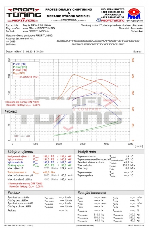 Posledná dieselová Toyota RAV4 s motorom 2.2 D-4D, ktorá disponuje technickým sériovým výkonom 150k (110kW) a 340Nm. Reálne odmeraný sériový výkon bol presne 150k a 335Nm. Po našej dôkladnej softvérovej úprave sme výkon navýšili na svižných 188k (138kW) a 406Nm.