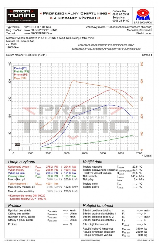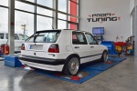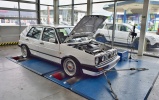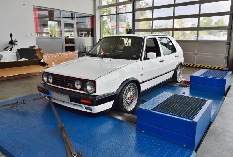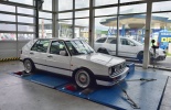 Predstavujeme Vám nádherný VW GOLF Mk 2. GTi swapnutým motorom VW Group 1.8T upraveným o väčší frontový intercooler, väčšie vstrekovače z Audi S3, väčší výfuk, samozrejme sanie a netreba zabúdať na poriadne Turbo K04, ktoré po našom odladení dosiahlo perfektný výkon 280k (205kW) a 400Nm pri váhe 1100kg! Treba dodať, aby sa zachovala pôvodná dizajnová charakteristika vozidla, majiteľ skryl frontový intercooler za predný nárazník, ktorý je počas merania veľmi zložité schladiť a preto sa nám už pri 5000 otáčok doslova prehrieval. Reálne na ceste je tento výkon vyšší, treba počítať okolo 290-300 koní!