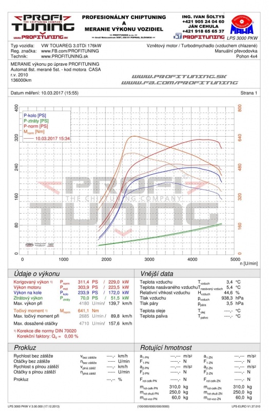 Dnes sme upravovali jedno z najobľúbenejších SUV na svete, VW TOUAREG s motorom 3.0 TDi (kód motora CASA) a sériovým výkonom 240k (176kW) a 550Nm. V spojení s 8 stupňovým automatom sa dá tento Touareg naozaj krásne upraviť. Odmeraný sériový výkon bol 245k a 550Nm, po našej len softvérovej úprave sme výkon navýšili na bezpečných 311k (229kW) a 641Nm (+66k +91Nm).